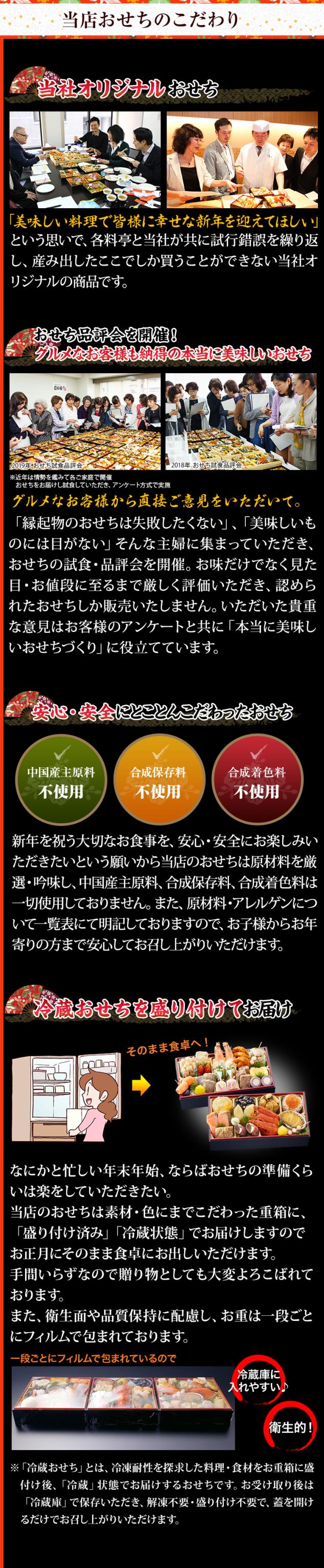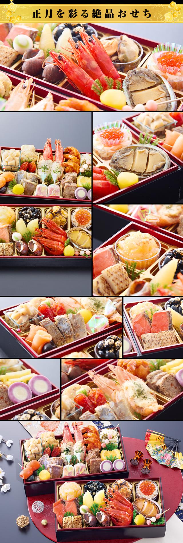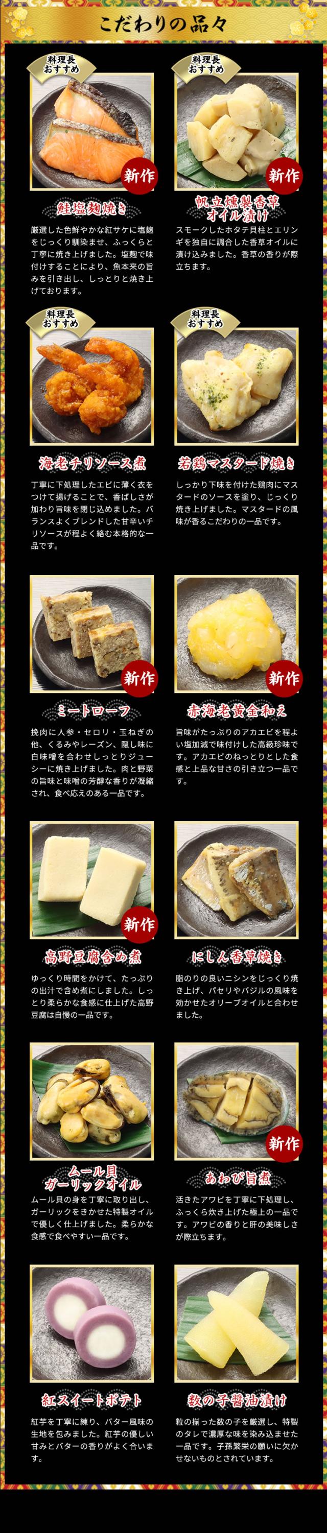 お正月の定番の縁起物はもちろん「胡麻団子」や「海老チリソース煮」といった中華に加え、洋風料理や「小倉羊羹祝い包み」などのスイーツまで入ったおせちでお子様や若い方にも喜んでいただける内容に仕立てました。今年は祝い膳に華を添える一品として、脂のり抜群のチョウザメに特製のウニソースをのせて焼き上げた「蝶鮫雲丹焼き」や、柔らかなイカに柚子をきかせた特製の明太子ソースを絡ませた「烏賊明太子昆布」など数々の新しいお料理も加わりました。