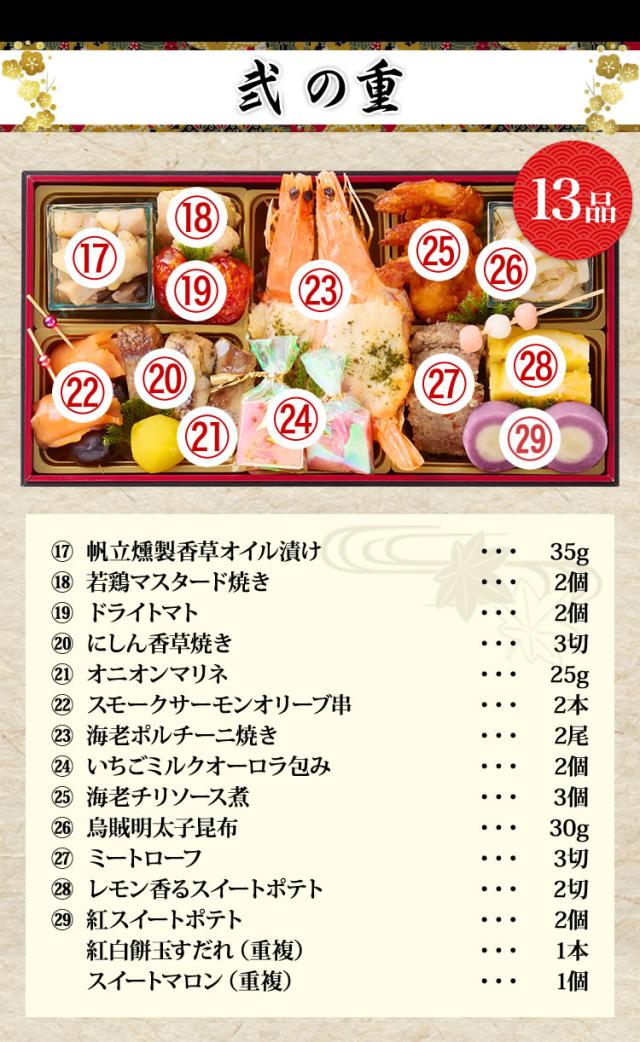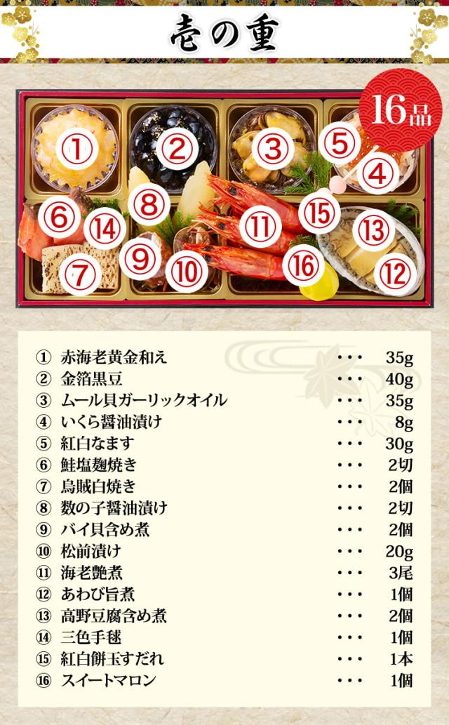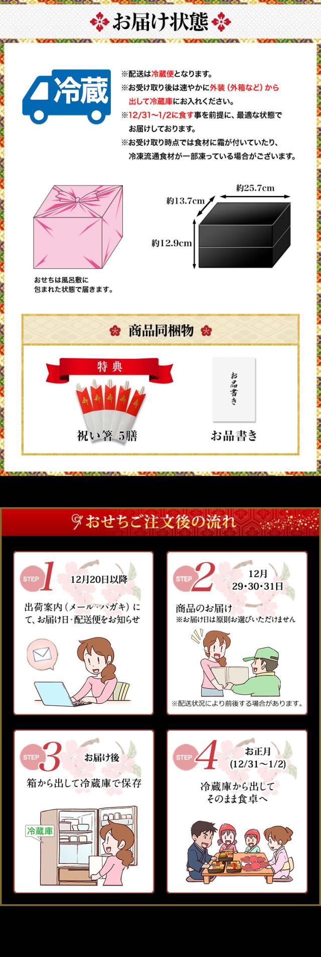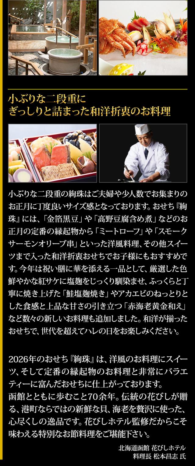 - 久しぶりのおせち料理で一人で頂いたのですが、北海道の海の幸を堪能させていただきましたが味に量と大満足でした。新年の挨拶にメニュー お正月仕様のお箸も添えられてくださって、お気遣いも有難く思いました。