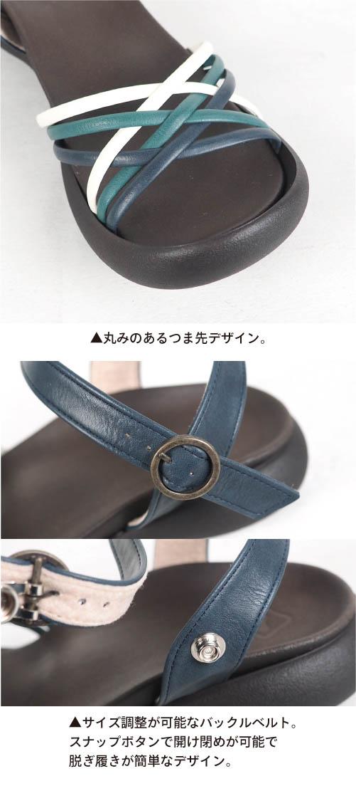 ■高低差をほとんど感じないフラットな履き心地が快適なサンダル。カラフルなPUレザー素材を編み込んだデザインが季節感満載!足首のストラップのおかげで踵が浮かずしっかり履くことができます。ストラップはスナップボタンで簡単着脱!バックルで長さも調節できます!安心、安全、快適、可愛い大注目のサンダルです。