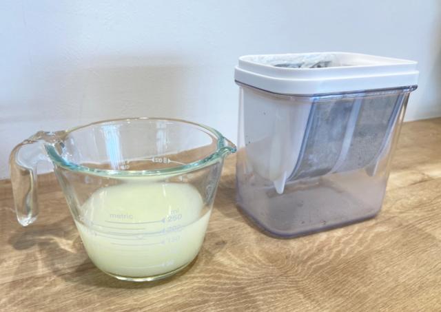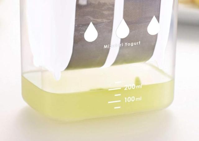 透明容器に水切り量の分かる目盛りが付いています。ホエーの切り具合が一目で分かり、硬さの目安になります。市販のヨーグルト丸ごと1パック入れることができます。