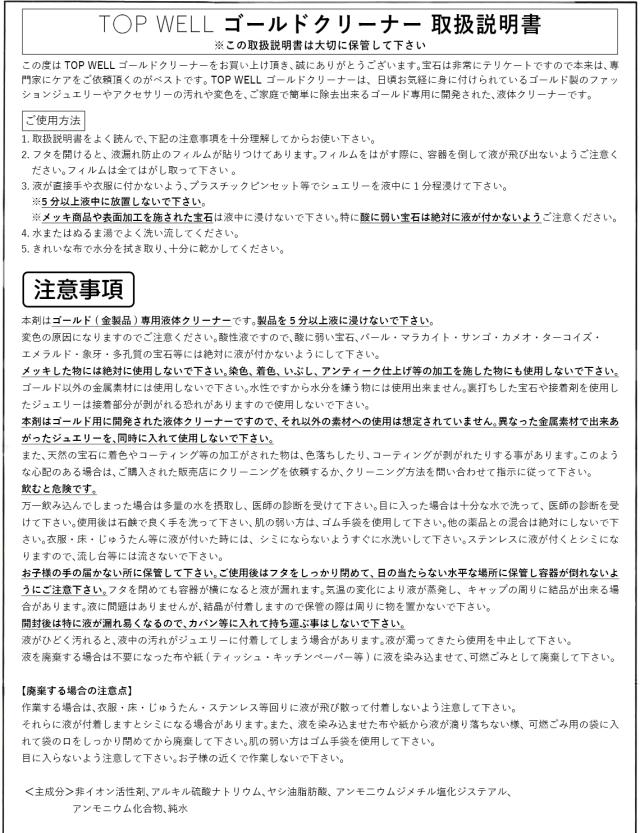 ゴールドやプラチナを素材としたファッションジュエリーやアクセサリーのお手入れ、汚れ落としに有効なジュエリー専用液体クリーナーです。