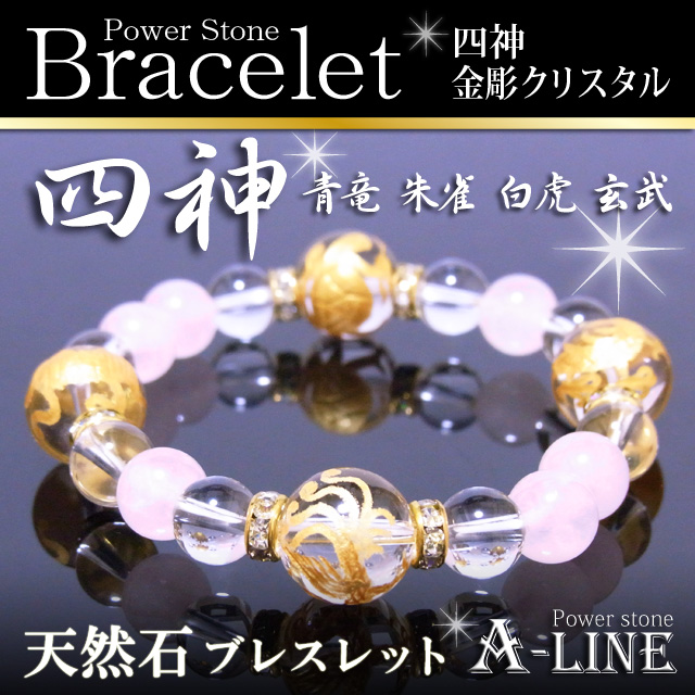 パワーストーン ブレスレット 四神金彫り水晶12mm&水晶&ローズクォーツ8mm 単品 PW-2594