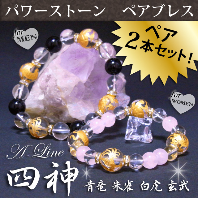 送料無料 パワーストーン ブレスレットペア2本セット 四神金彫り水晶12mm&オニキス&ローズクォーツ PW-2595