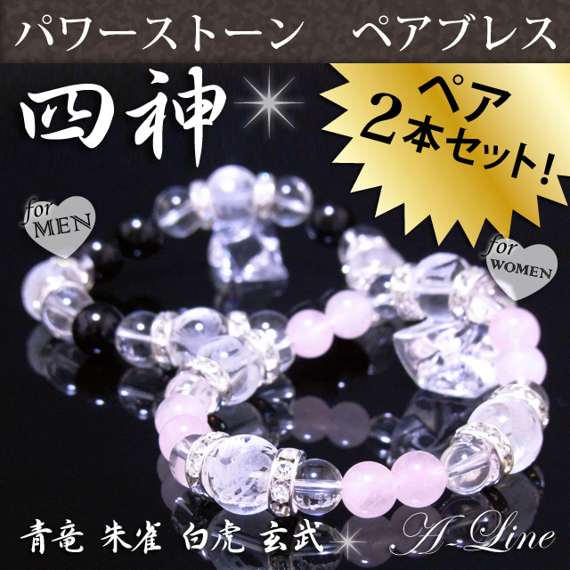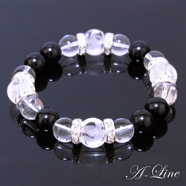 パワーストーン ブレスレット ペア2本セット 四神素彫り水晶12mm&オニキス&ローズクォーツ PW-2602