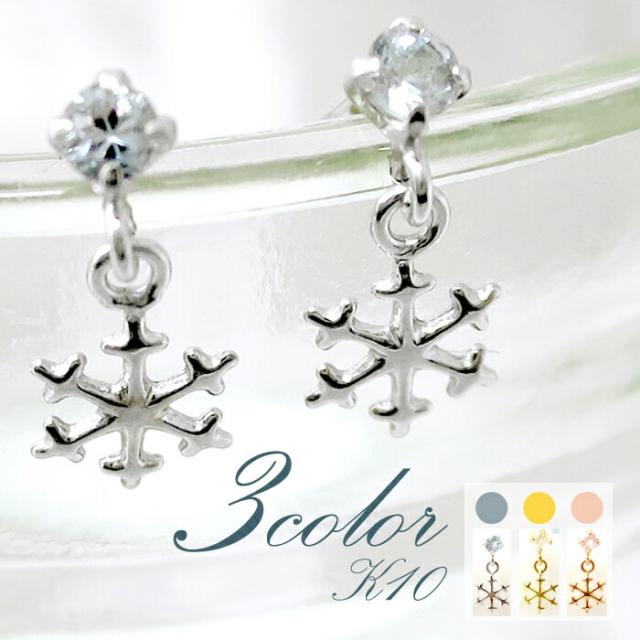 選べる3カラー K10 天然石 揺れる雪の結晶 スタッズ ピアス (2P両耳) /10金/ゴールド/レディース/ピアス/両耳