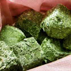 アルファルファを固めたキューブ状の牧草です。
