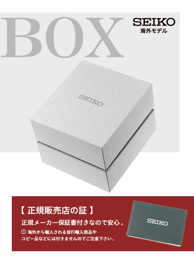 | 付属品 | 保証書・SEIKO純正ボックス ※環境問題への取り組みの一環として、取扱説明書は電子化となりました。 詳細は付属の保証書をご確認ください。 |