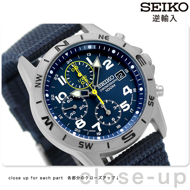 正規品 7年保証キャンペーン SEIKO 逆輸入 海外モデル 高速クロノグラフ SND379P2 セイコー メンズ 腕時計 クオーツ ネイビー ナイロンベルト 日本製ムーブメントを搭載。組み立ては海外で行われており、主に海外の市場で流通しているモデルを逆輸入。1/20秒計という高速クロノグラフや日本製ムーブメントを搭載しながらも、高いコストパフォーマンスを実現。海外モデルには通常付属しないメーカー保証つきなので、安心してお使い頂けます。 国内で高い支持を得る縦三つ目のクロノグラフやミリタリーテイストのナイロンベルトが魅力的なモデル。オールシーズン使えるデザイン性や、暗闇での視認性を向上させる蓄光塗料など実用性を兼ね備えています。 商品タグ品番:SND379R
