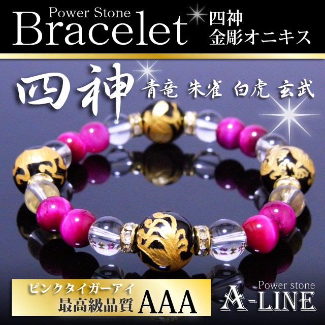 パワーストーン ブレスレット 四神金彫りオニキス12mm&AAAピンクタイガーアイ&水晶8mm 単品 PW-2609