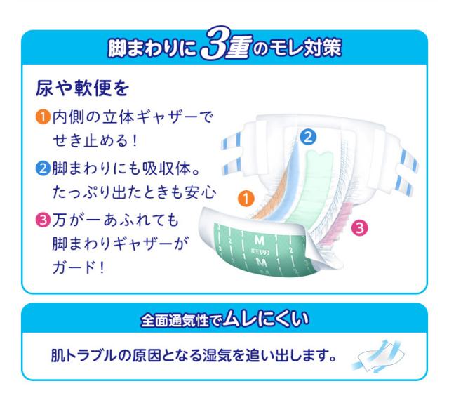 ●立体ギャザーと脚まわり吸収体が、パッドから溢れた尿や軟便をせき止めます。しかも、外側の脚まわりギャザーが脚まわりにフィットし、隙間モレを防ぎます。