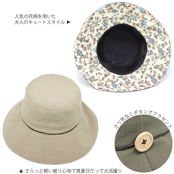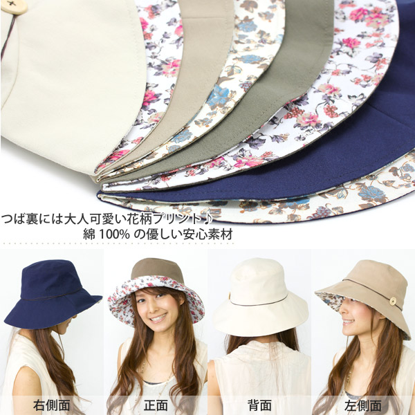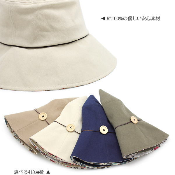 さらっとしたコットン製の軽い被り心地が嬉しいつば広ハットです。つばをちょっぴり折り返せば大人可愛い花柄がチラリ。サイドにさりげなくワンポイントだけ飾りつけられたボタンや紐リボンもちょっとしたアクセントになっていてとってもキュート♪大げさすぎない、程よく可愛らしい印象で被りたい!という方や、ファーストUVハットデビューの方にもオススメです☆