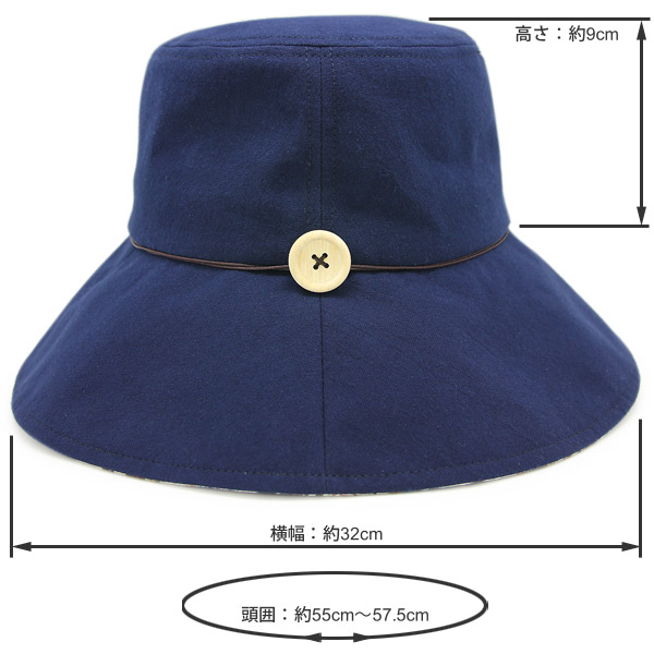 | サイズ | サイズ表記57.5cm(頭囲:約55〜57.5cm、高さ:約9cm、横幅:約32cm[つばも含む]、つばの長さ:約9.5cm) |