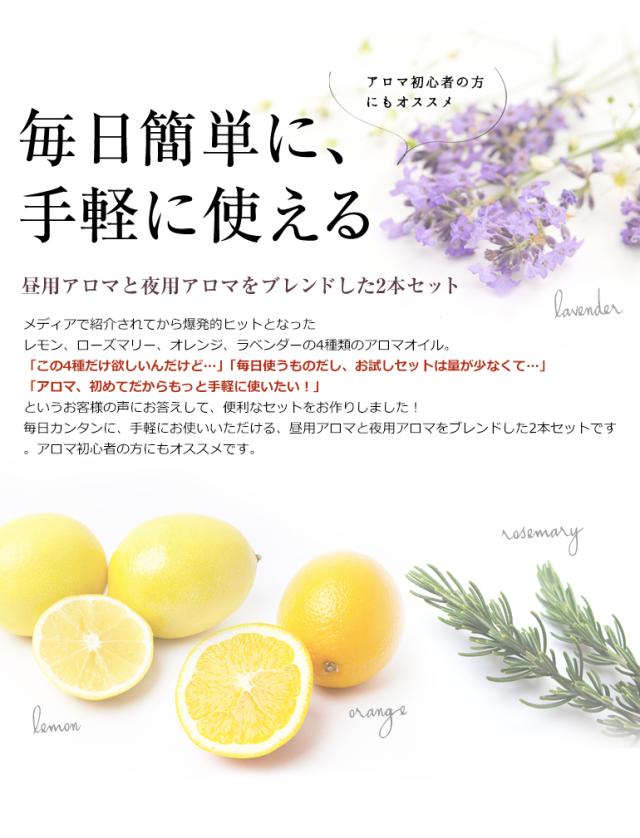 【特徴】TVで話題!人気アロマの使いやすいセットができました!爆発的ヒットとなったレモン、ローズマリーオレンジ、ラベンダーの4種類のアロマオイル。この4種だけほしいんだけど・・・」「毎日使うものだしお試しセットは量が少なくて・・・」「アロマ、初めてだからもっと手軽に使いたい!」というお声にお応えして便利なセットをご用意したしました。