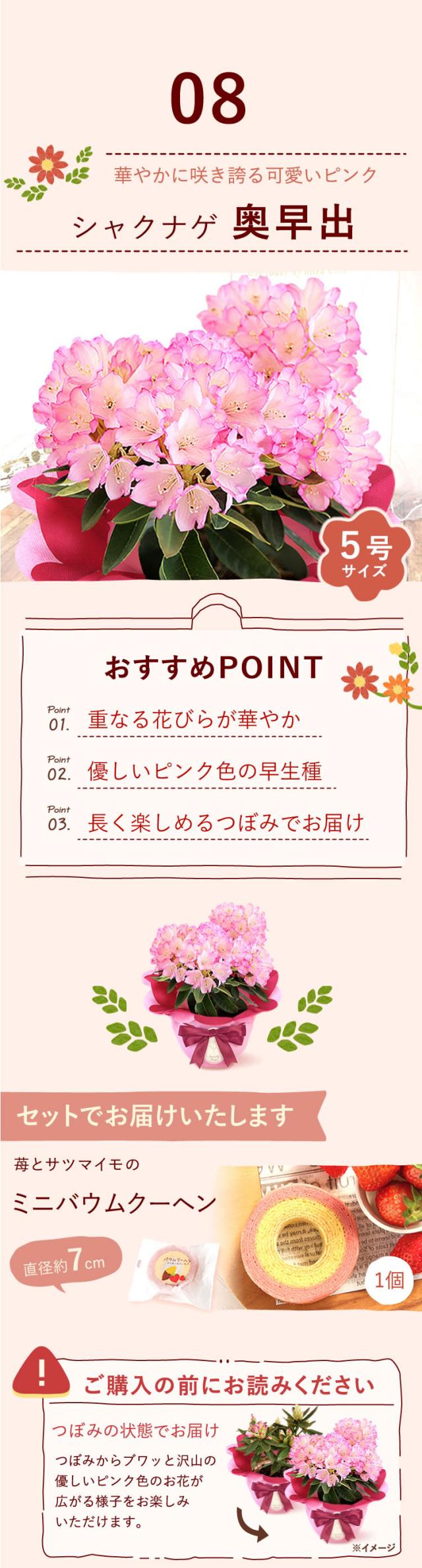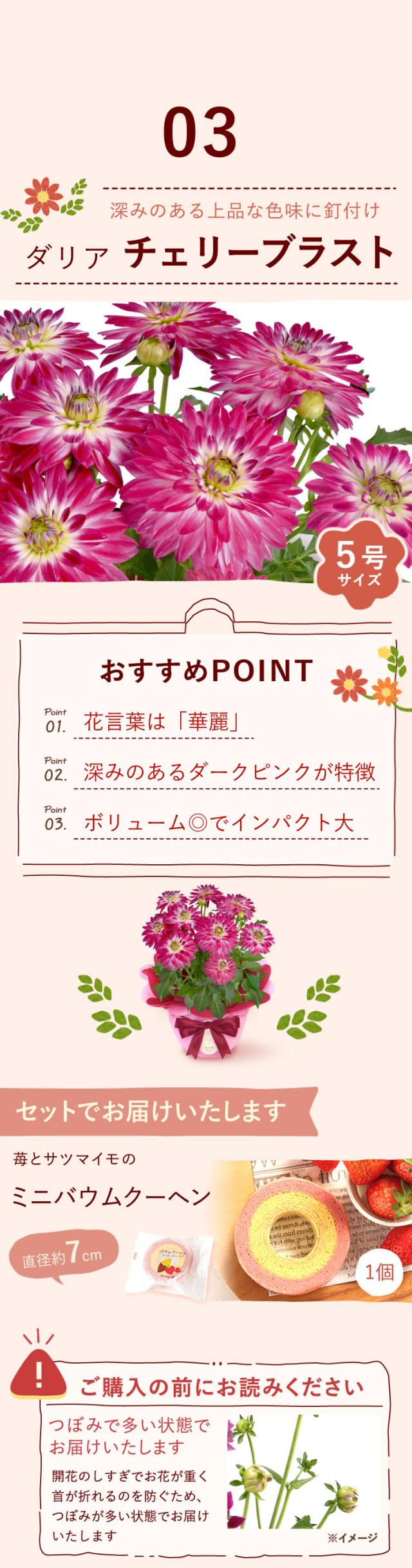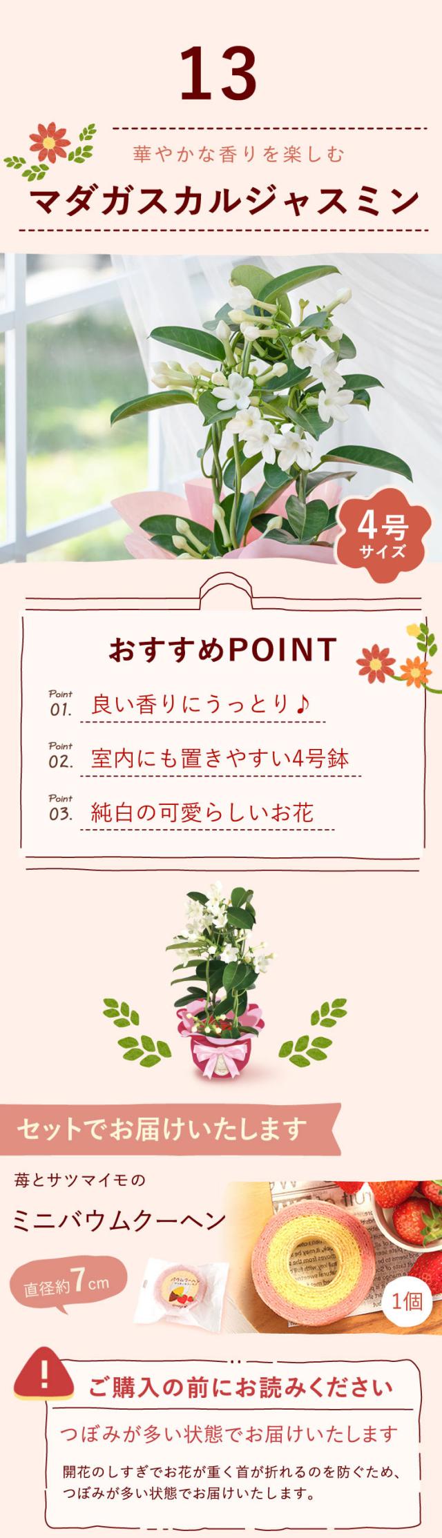 | 商品内容 | ○選べる鉢植えのお花 1鉢 ○苺とサツマイモのバウムクーヘン 1個 ※お花とスイーツは同じ箱でのお届けとなります。 |