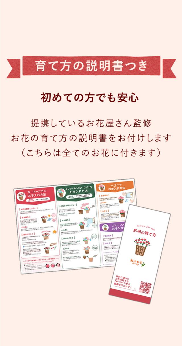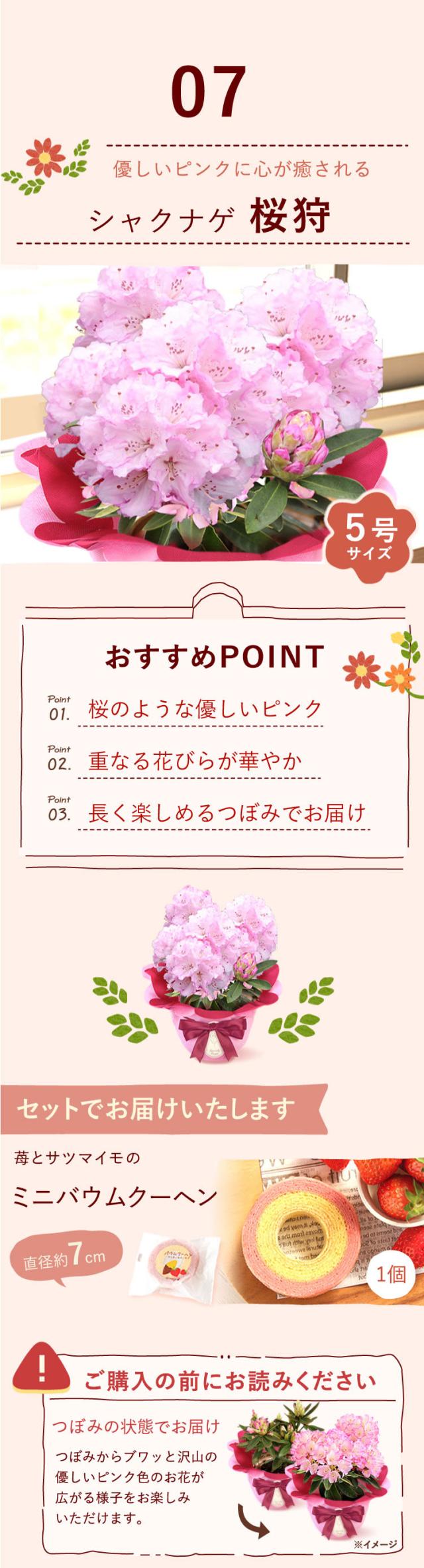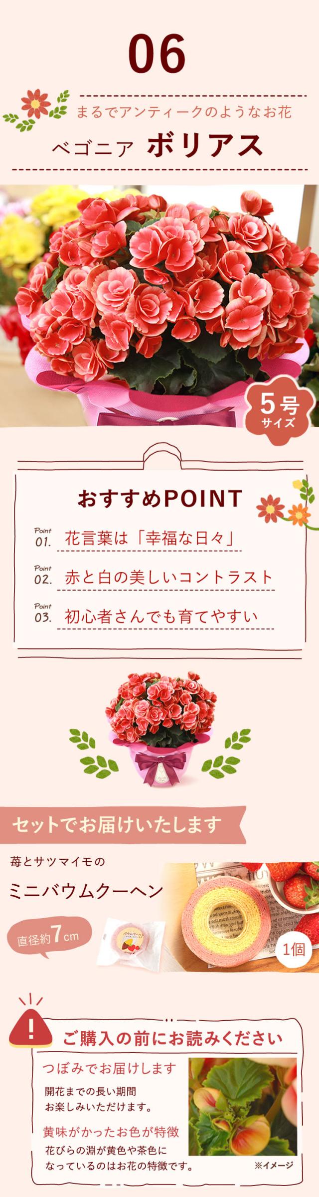 | 商品内容 | ○選べる鉢植えのお花 1鉢 ○苺とサツマイモのバウムクーヘン 1個 ※お花とスイーツは同じ箱でのお届けとなります。 |