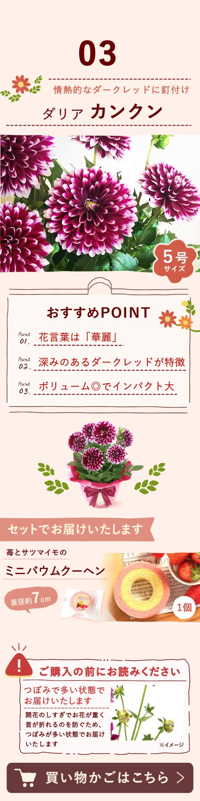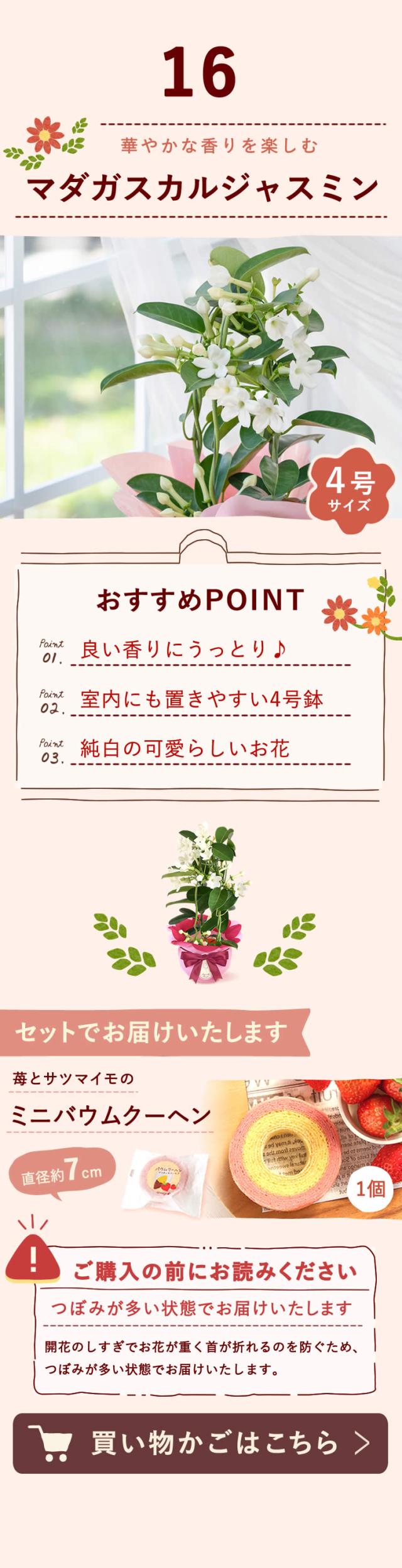 | 商品内容 | ○選べる鉢植えのお花 1鉢 ※下記の中からお選びください ダリア【タンピコ】 ダリア【メンドーサ】 ダリア【カンクン】 マーガレットの寄せ植え ベコニア ボリアス こんぺいとう【ブルー】 こんぺいとう【ピンク】 シャクナゲ【奥早出】 シャクナゲ【桜狩】 デュランタ ゆり【オレンジピクシー】 ゆり【ロザリン】 ゆり【シュガーラブ】 バラ 【スイートハートメモリー】 バラ 【スイートルビー】 マダガスカルジャスミン(4号鉢) ○苺とサツマイモのバウムクーヘン 1個 ※お花とスイーツは同じ箱でのお届けとなります。 |
