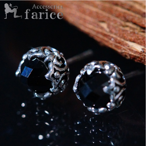 ユリの紋章サイドラウンド装飾 大粒ローズカットブラックキュービックジルコニアメンズシルバー925スタッドピアス
