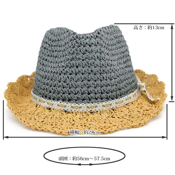 | サイズ | サイズ表記57.5cm(頭囲:約56〜57.5cm、高さ:約13cm、横幅:約28cm[つばも含む]、つばの長さ:約6cm) |