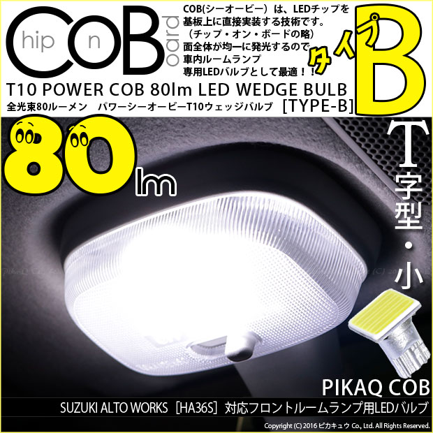 | スズキ アルトワークス[HA36S]対応フロントルームランプ用LEDバルブ T10 POWER COB 80ルーメンLEDウェッジバルブ [タイプB] 形状:T字型-小 LEDカラー:ホワイト 1セット1個入り | ||||