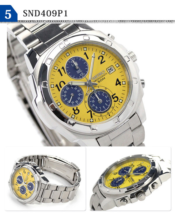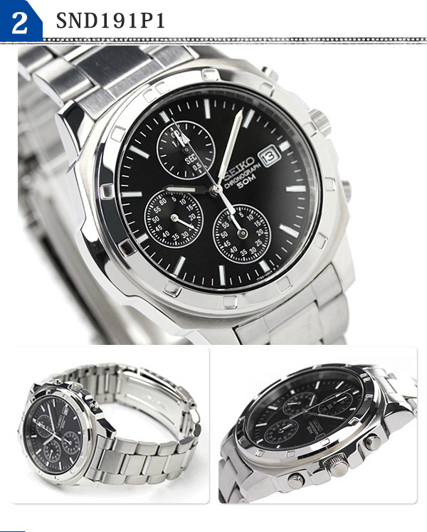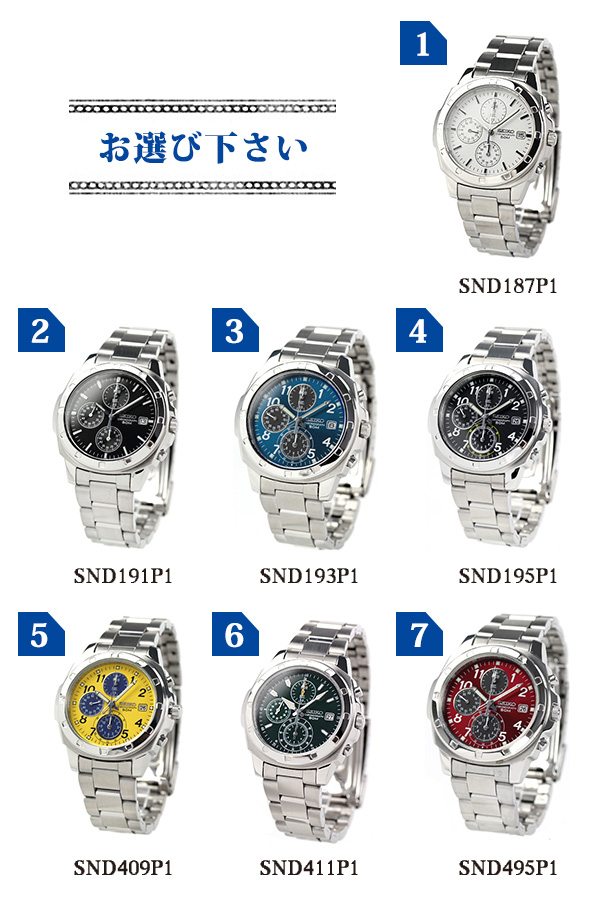 正規品 7年保証キャンペーン SEIKO 逆輸入 海外モデル 高速クロノグラフ 腕時計 選べるモデル SND195 日本製ムーブメントを搭載。組み立ては海外で行われており、主に海外の市場で流通しているモデルを逆輸入。1/20秒計という高速クロノグラフや日本製ムーブメントを搭載しながらも、高いコストパフォーマンスを実現。海外モデルには通常付属しないメーカー保証つきなので、安心してお使い頂けます。 国内で高い支持を得る縦三つ目のクロノグラフが魅力的なモデル。オールシーズン使えるデザイン性や、暗闇での視認性を向上させるルミブライトといった実用性を兼ね備えています。 SND187P1 SND191P1 SND193P1 SND195P1 SND409P1 SND411P1 SND495P1