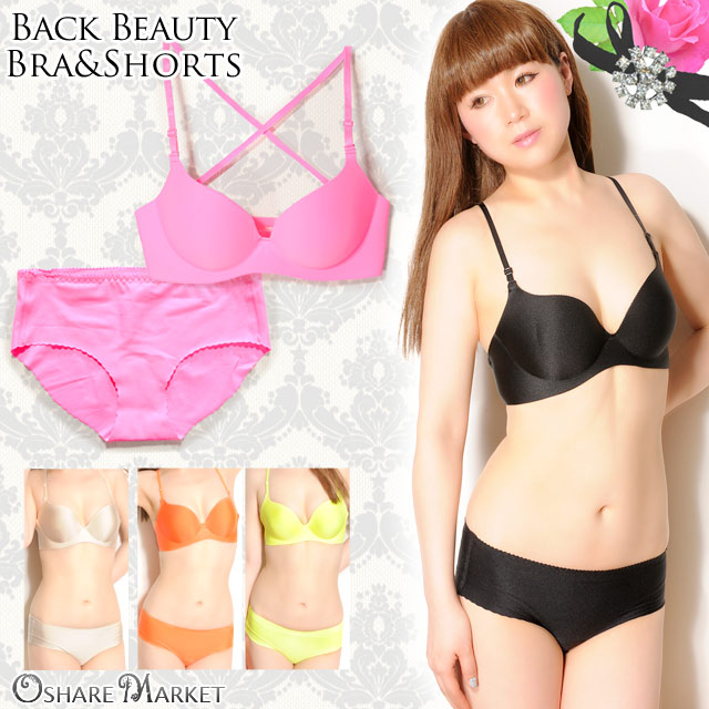 カラフルな5色展開!セクシーに背中見せ☆ブラジャー&ショーツセット。背中が開いたアウターにぴったりの思わず見せたくなる美しいバックスタイル★アウターに響きにくいシンプルなモールドカップで使いやすいです♪ブラック・ベージュ・ピンク・オレンジ・イエローの5色ご用意いたしました。