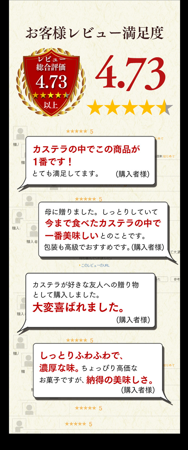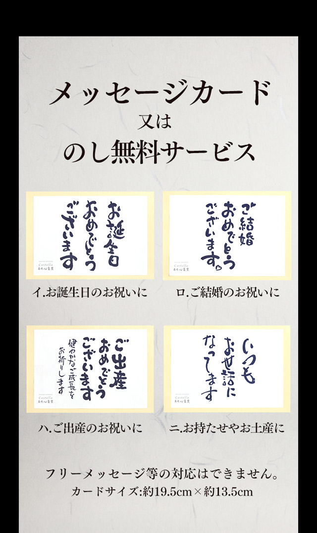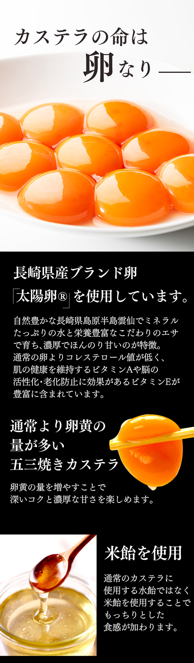 ●原材料:鶏卵(国産)、砂糖、小麦粉、米飴、ザラメ糖、蜂蜜