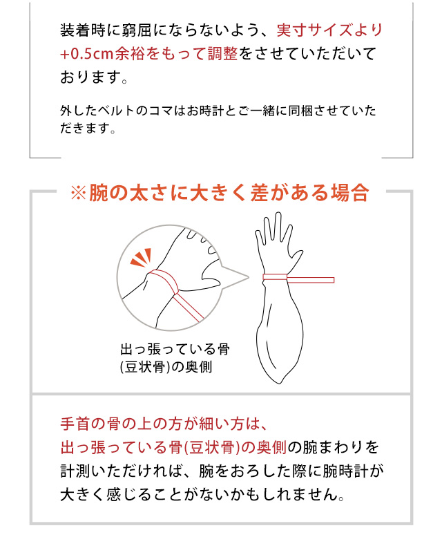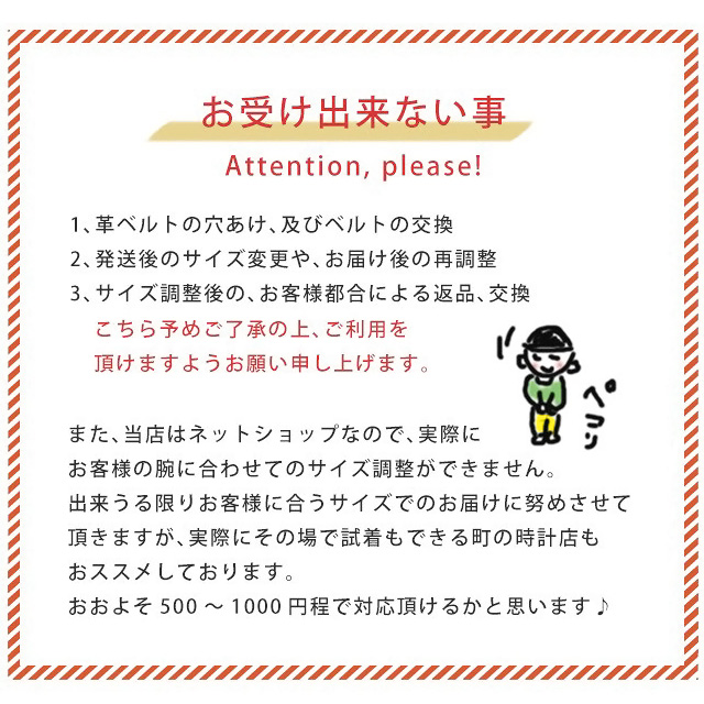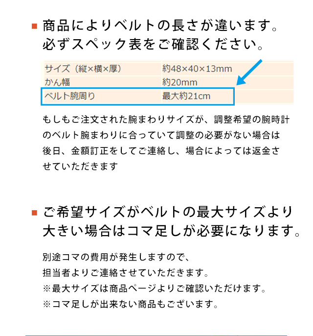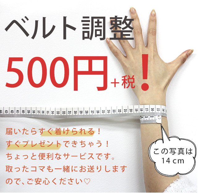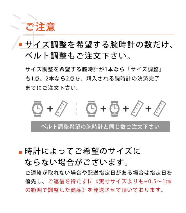 必ず御希望商品と一緒にご注文お願いします。一商品につき調整サービスは一本となりますのでご注意くださいませ。記載させて頂いておりますサイズより大きいサイズはお受けできませんのでご了承お願いいたします。また、サイズ調整をご希望の場合、お届けにお時間がかかる場合がございますので、その点も予めご了承の上、ご注文頂ければと思います。他、調整が不可能な場合や詳細の確認等でお電話にて確認させて頂く場合がございます。