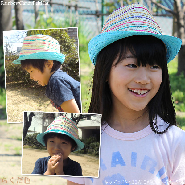 とってもやわらかくて軽い被り心地がお子様に優しい中折れハットです。大人のハットと同じように高さがあり、見た目には申し分ないくらいカッコよくスタイルのいい形☆それをぐるぐると虹色ボーダーで巻き上げた、まるでぐるぐるキャンディのようなキュートでカラフルな色使いはお子様用ならではのポップなデザインです♪