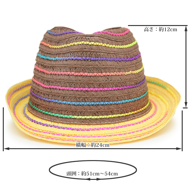 | サイズ | サイズ表記52〜54cm(頭囲:約51.5〜53.5cm、高さ:約12cm、横幅:約24cm[つばも含む]、つばの長さ:約5cm) |