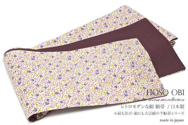 こちらの半幅帯は日本製ですので、素材にこだわり細部まで丁寧に作られています。また、仕立て上がりですので届いてすぐにご使用いただけます。 小花柄がデザインされており、レトロモダンな着物のコーディネートに大活躍してくれる半幅帯です。リバーシブルの小袋帯ですので裏面は無地の帯としてもお使い頂けます。