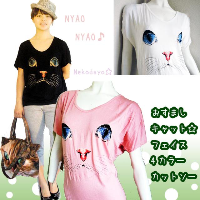 送料無料 Tシャツ 猫顔 ねこ 子猫 キャット フェイス カットソー ゆるかわ おすまし 青い瞳 後ろ下がり ドルマン トップス 半袖 原宿系 ネコ好きさんにおすすめ