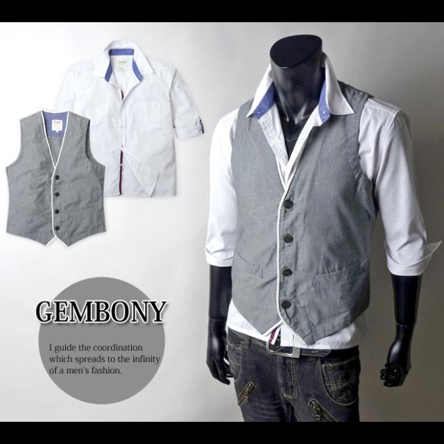 メンズ シャツ アンサンブル 7分袖 GEMBONY ジェムボニー ダンガリーベスト付き 袖ロールアップ 前立て切替