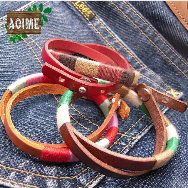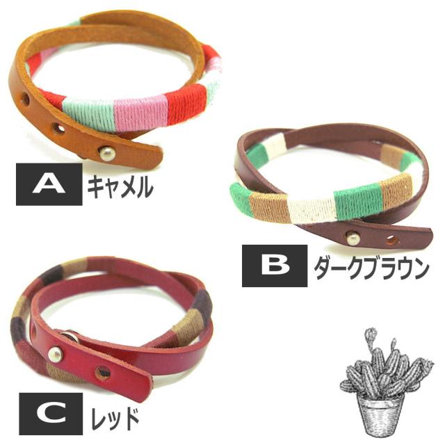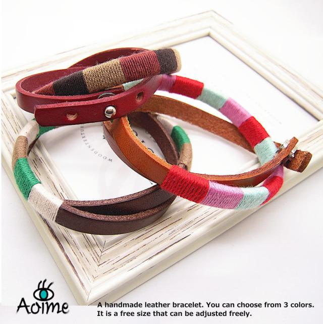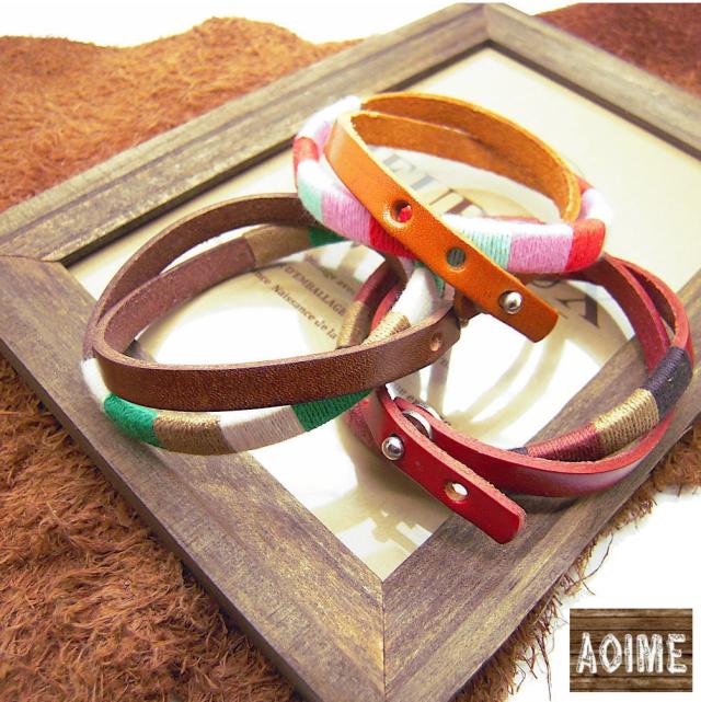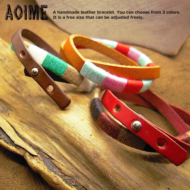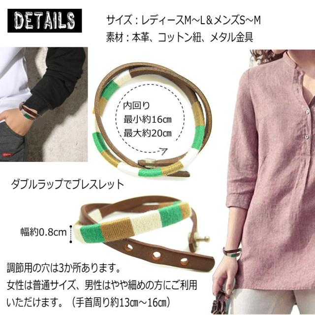 男性女性問わずおすすめ。天然素材で程よいナチュラルテーストのデザインです。レザーにコットン糸をていねいに巻きつけたハンドメイドです。独特の色使いが良い感じ☆