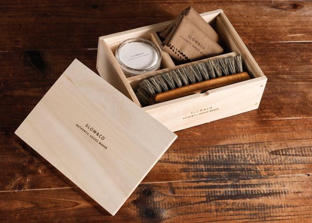 SLOW/スロウ/maintenance kit/メンテナンスキット/メンテナンス/ケア/レザーケア/クリーム/レザークリーム/SLOWオリジナルクリーム/オリジナルクリーム/メンテナンスオイル/レザー/革/ブラシ/馬毛/コットンクロス/クロス/セット/木箱/送料無料/ポイント10%