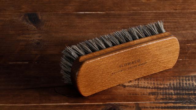 表面のホコリ落としや専用クリームをすり込み馴染ませる際にも便利なブラシです。指にフィットする窪みのついた握りやすいつくりの持ち手。さらに、全体のフォルムは手に持った時の落ち着く角度で設計されており、腕を動かしやすい絶妙なカーブに仕上げられています。
