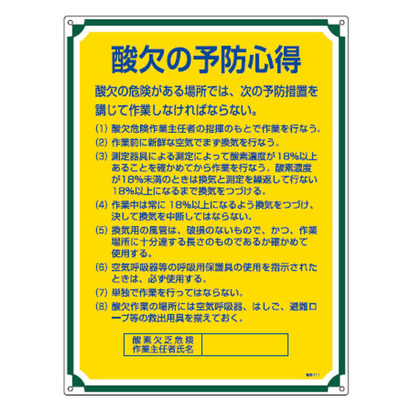 管理標識板 「酸欠の予防心得」 60x45cm 両面テープ6枚付 ( 看板 訓示 パネル 標識板 標識 注意喚起 標語 注意 喚起 標示看板 案内板 両面テープ ネジ 壁 安全用品 業務用品 )