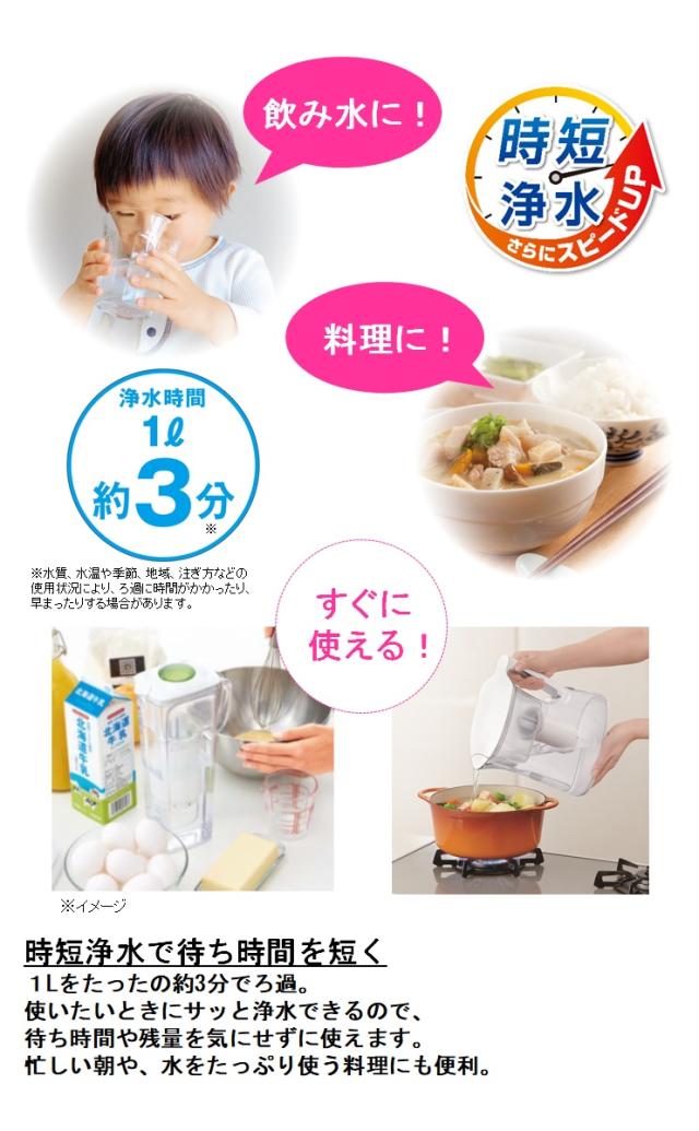 ●高速ろ過/時短浄水。東レのろ過システムで高い除去性能とおいしさはそのままに、浄水スピードアップを実現。使いたいときにサッと浄水でき、待ち時間や残量を気にせずに使えます。
