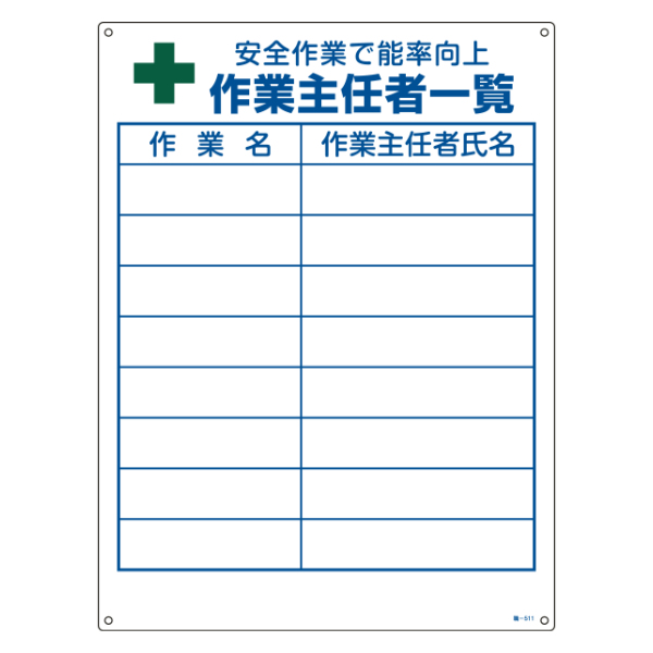 職務標識板 作業/作業主任者一覧表 60×45cm 両面テープ6枚付 ( 看板 訓示 パネル 壁掛け 氏名 名前 明記 書き込み 作業主任者 引っ掛け穴 付き )