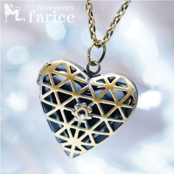 アンティークゴールドカラー フラワー&三角網目模様 ハート型 レディースロケットアロマペンダントネックレス【あずきチェーン付き】