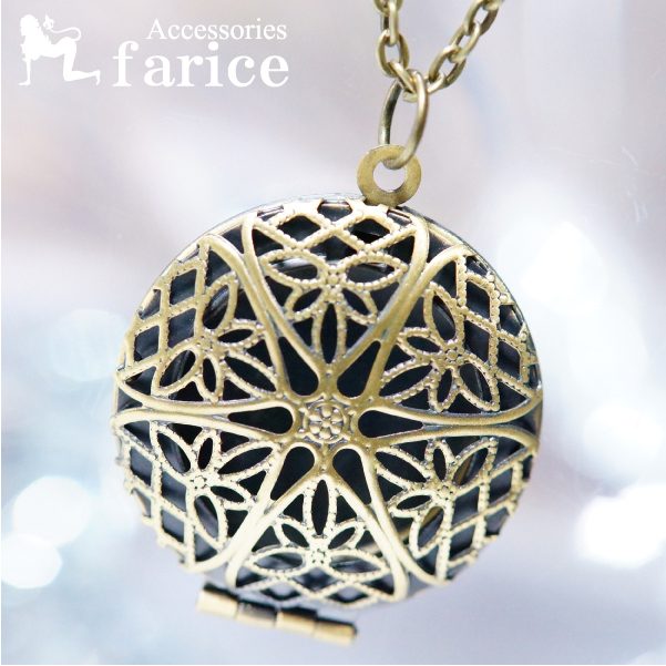 アンティークゴールドカラー スター&フラワー透かし丸型 レディース ロケット アロマ ペンダントネックレス【あずきチェーン付き】