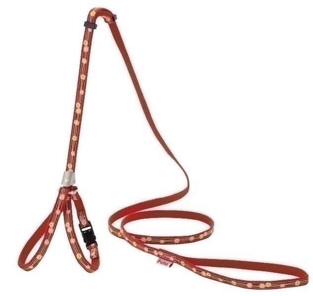 和風テイストのおしゃれなネコちゃん専用胴輪付引ひも。調節クリップを下げるだけの簡単調節でぴったりフィット。反射鈴付。