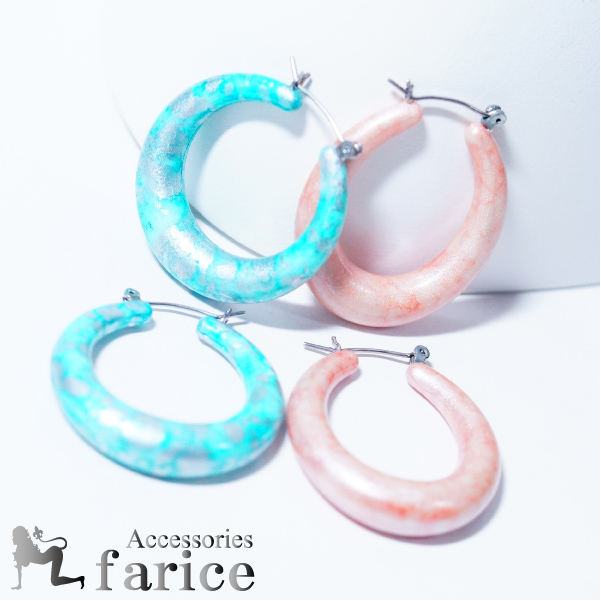ヒョウ柄&マーブルデザイン カラフルレディースオーバルフープピアス【ブルー or ピンクカラー】