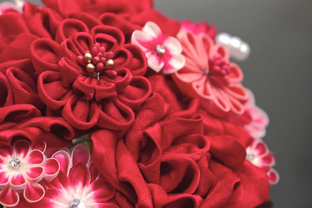 菊のつまみ細工の中心のビジューや、サイドにはパールビーズを合わせたゴージャスな花飾りです。