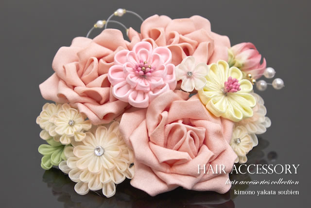 菊と薔薇のつまみ細工のコーム式髪飾り。