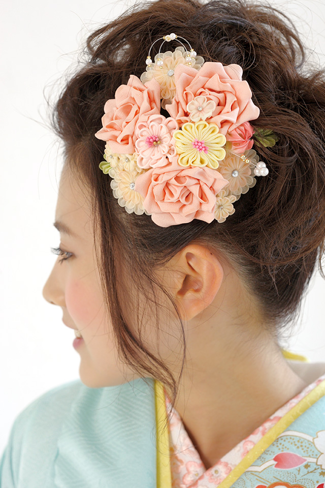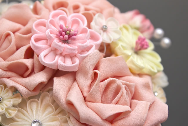 菊のつまみ細工の中心のビジューや、サイドにはパールビーズを合わせたゴージャスな花飾りです。