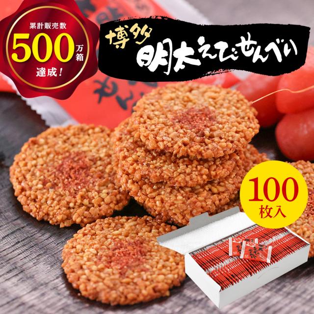 博多辛子明太子を贅沢に使用した明太えびせんべいを大容量の100枚入りの登場です。さらに全国送料無料にてお届けします