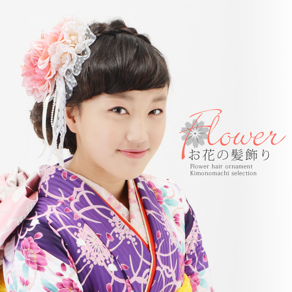 【Prices down3】お花 髪飾り「ピンク×白色 花とレース レースリボン」 成人式 花 振袖髪飾り 振り袖