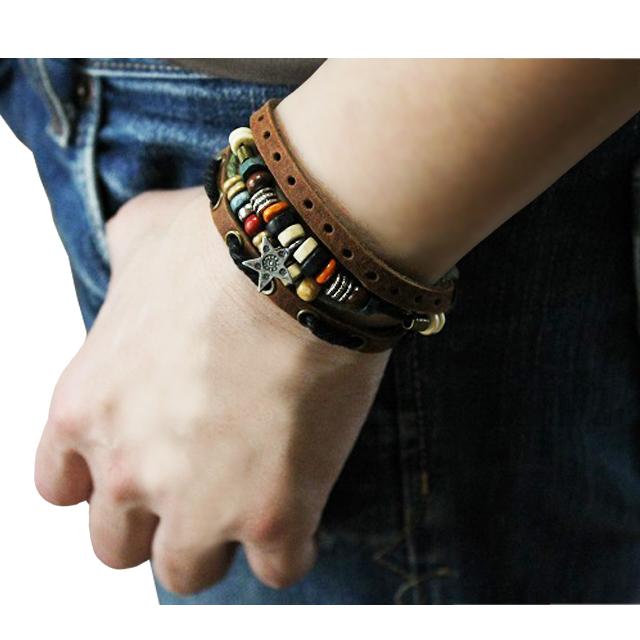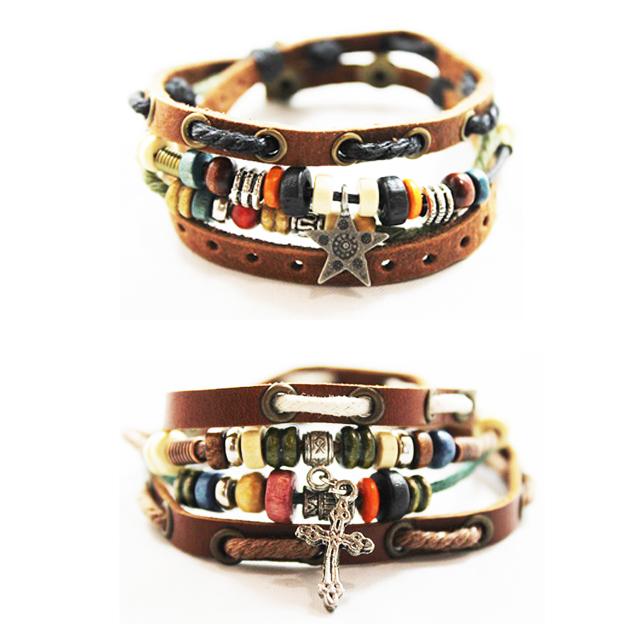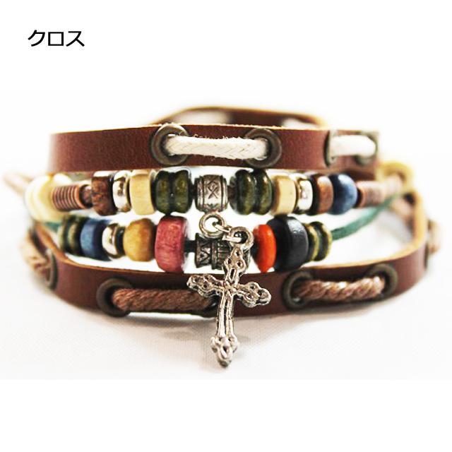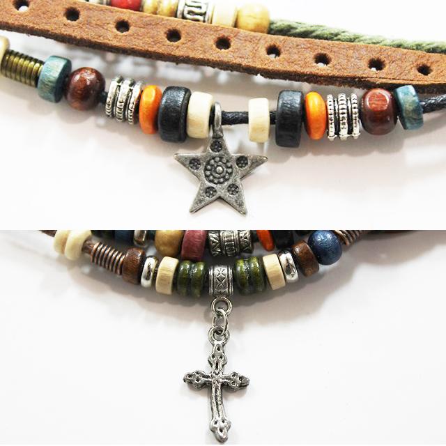 牛革&コットンロープを使い、ポイントにウッドカラービーズやメタルを施したチャーム付きブレスレッド。