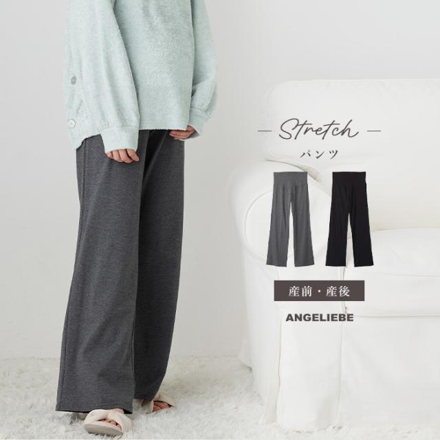 ウエストの後ろはゴムシャーリングでずり落ち防止。妊娠初期から臨月まで、いつでも程よいフィット感で着られます。ウエスト部分を折り返せば、産後にも対応。