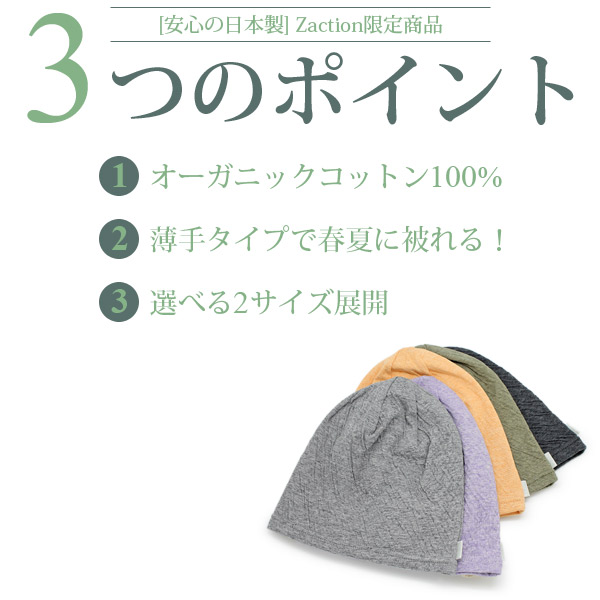 確かな品質と被り心地が安心の、オーガニックコットン100%の生地を使用したZactionオリジナルニット帽です。以前よりご好評いただいておりましたもの同様、クッションのような柔らかな肌触りはそのままですが、より薄い一枚仕上げのプレーンワッチに仕上げました。暑い季節でも快適に被りたい人や、薄手をご希望の方にオススメです。オーガニックコットンの良さは、お肌にアレルギーなどがある人でも安心して被っていただけるという点。サイズも前回同様、MサイズとLサイズの2種類をご用意させていただきました。季節に応じて二つを使い分けていただくことをオススメします☆